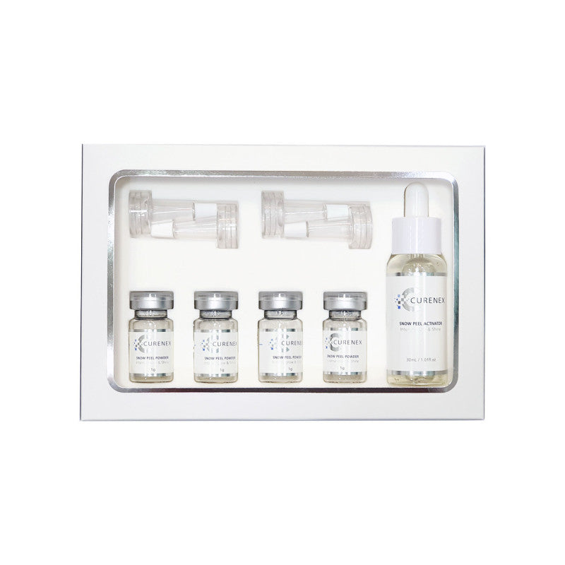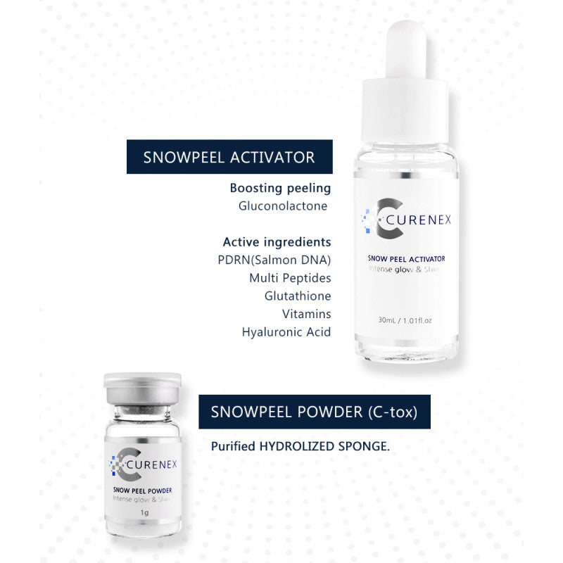 - Lightening- glutathione and Niacinamide in the Curenex Snowpeel activator help remove free radical and inhibits the activity of the ingredients that make melanin pigments.
