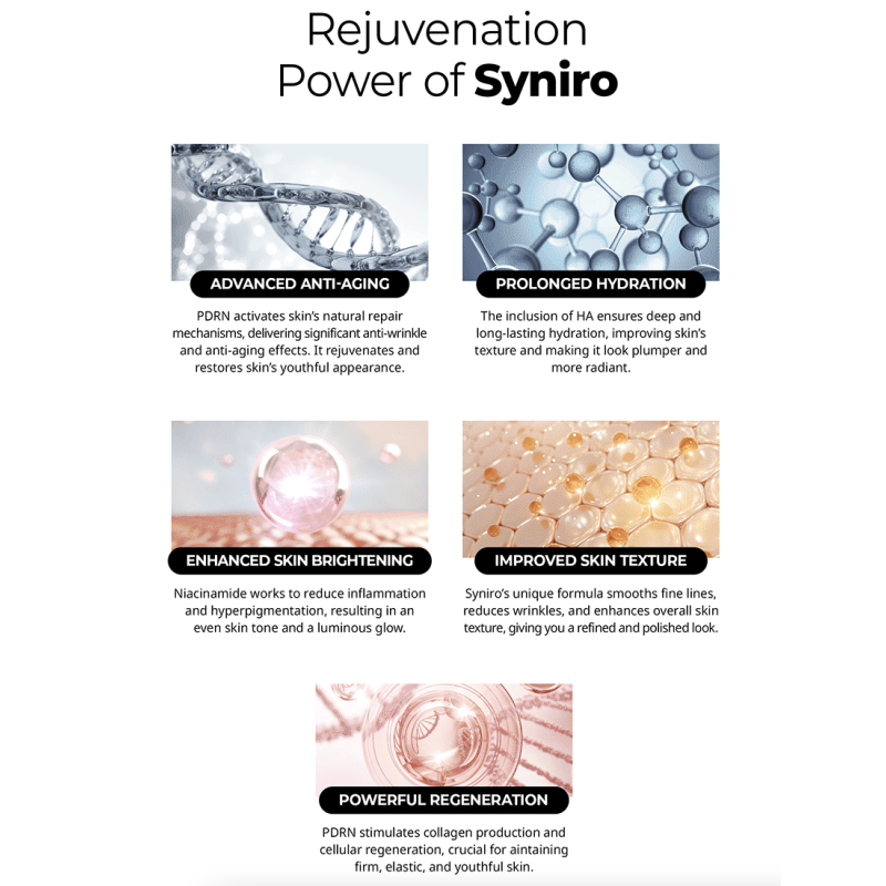 Syniro PDRN is a unique product that allows you to rejuvenate your skin through the following mechanisms: